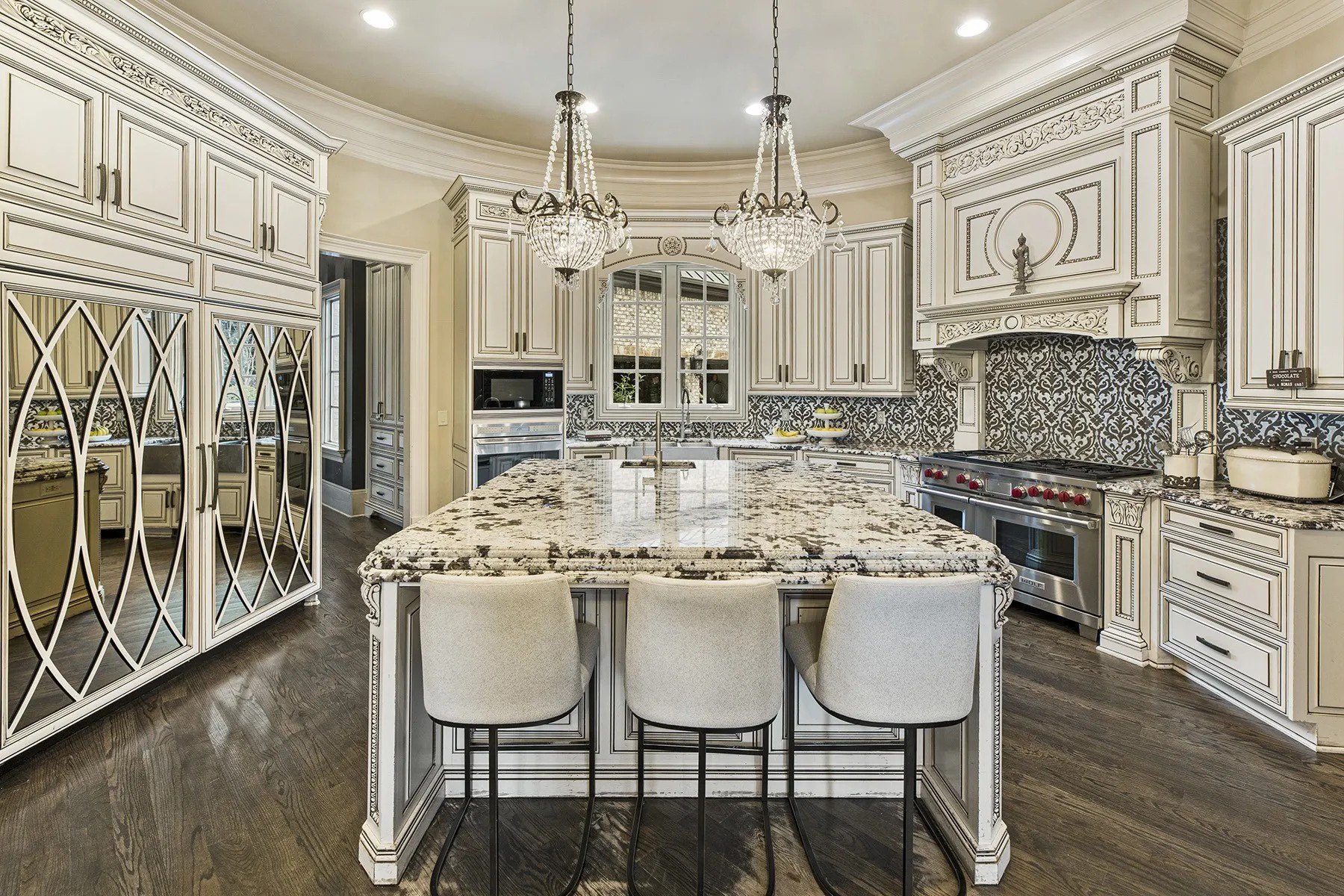A four-bedroom estate surrounded by columns and stunning wraparound covered porch boasts a 7,673-square-foot interior designed for grand-scale entertaining.