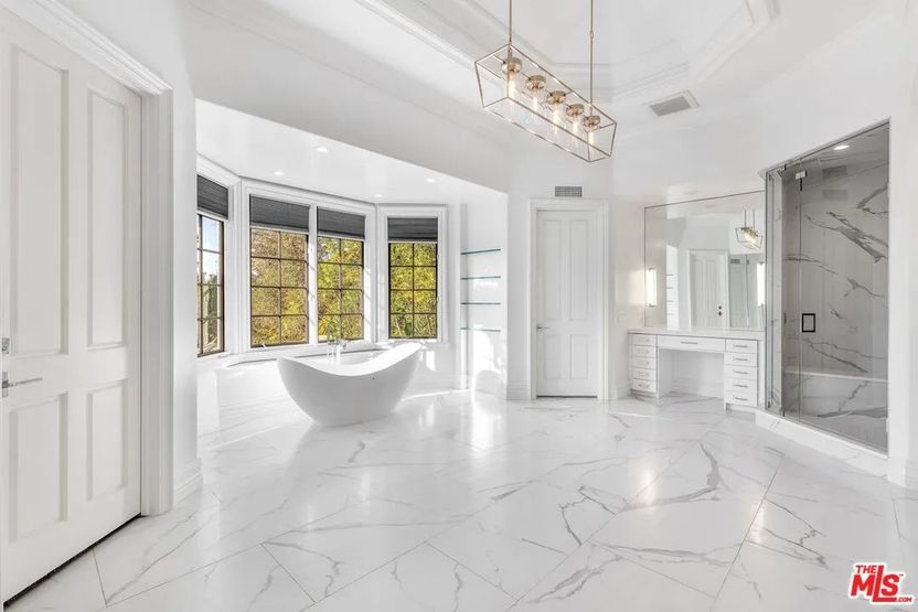 The primary suite features a superb main bathroom with a double-entry shower, dual vanities and water closets, a sauna, and huge soaking tub. The chic bedroom opens to a balcony that overlooks the backyard.